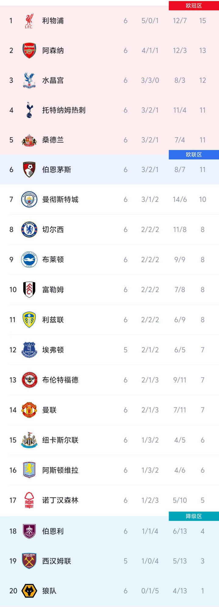 积分榜后半段,开局不佳的曼联、纽卡、维拉、森林按顺序在第14-17名,狼队则继续垫底。