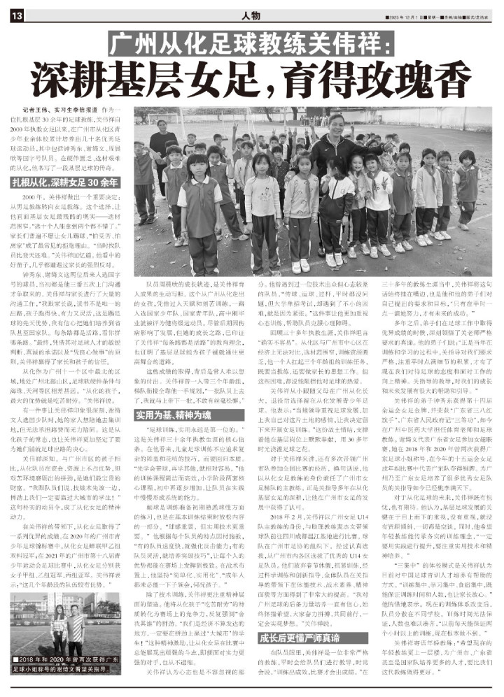 记者王伟、实习生李信报道 作为一位扎根基层30余年的足球教练,关伟祥自2000年执教女足以来,在广州市从化区青少年业余体校累计培养出几十名优秀足球运动员,其中包括钟秀东、谢绮文、周晨欣等国字号队员。在硬件匮乏、选材艰难的从化,他书写了一段基层足球的传奇。
